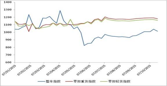 进入10月中下旬,在经历了十一假期后公路物流市场需求的高潮后,公路货运量总体趋于平稳,公路物流价格较前期小幅回落。从后期走势看,随着“双十一”等电商促销活动临近,未来零担指数可能呈现企稳回升的走势,而整车指数可能仍将延续平稳走势。