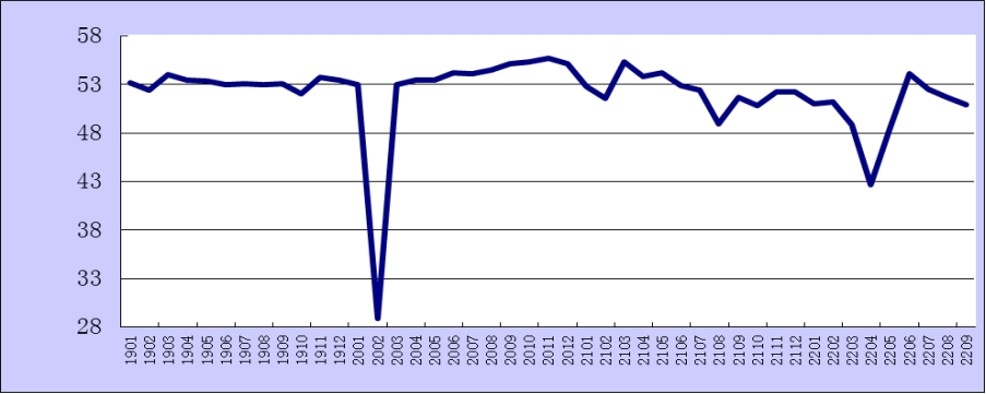 其中,2022年9月份,制造业生产指数为51.5%,较上月上升1.7个百分点;非制造业商务活动指数为50.6%,比上月下降2个百分点。