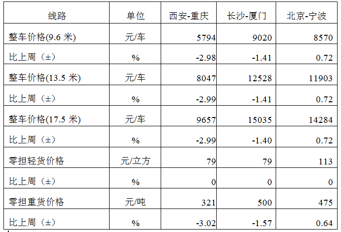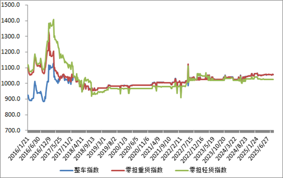 分车型看,各车型指数环比涨跌互现。其中,整车指数为1057.09点,比上周回落0.05%;零担轻货指数为1026.13点,比上周回升0.03%;零担重货指数为1056.78点,比上周回落0.17%。