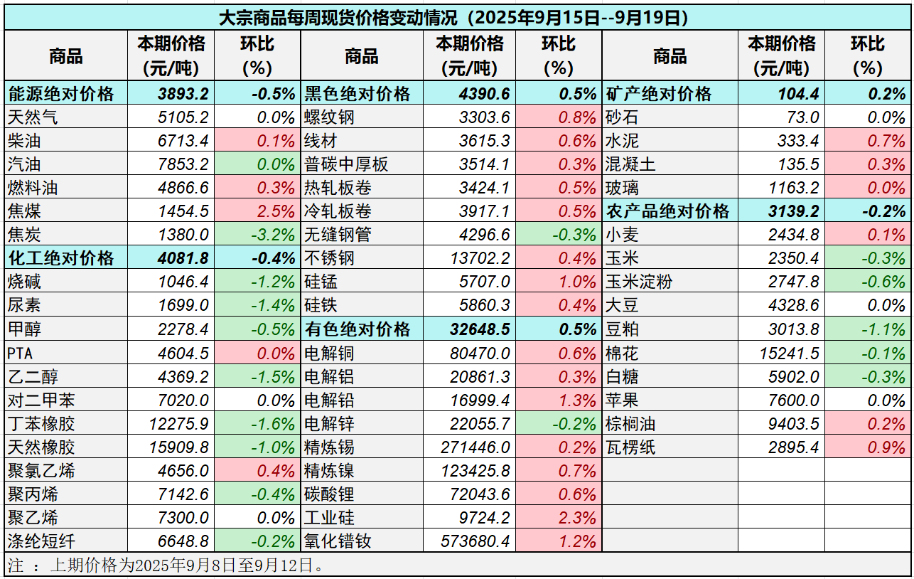 本表所示大宗商品价格(类别与产品规格说明见附表)为以人民币计价的现货价格(包含流通费用、利润和税费等)。计算这些价格时使用的信息来源,主要包括国内重点地区的生产商、贸易商及下游消费企业之间的成交、询报盘及可成交价格。价格单位为人民币元/吨。