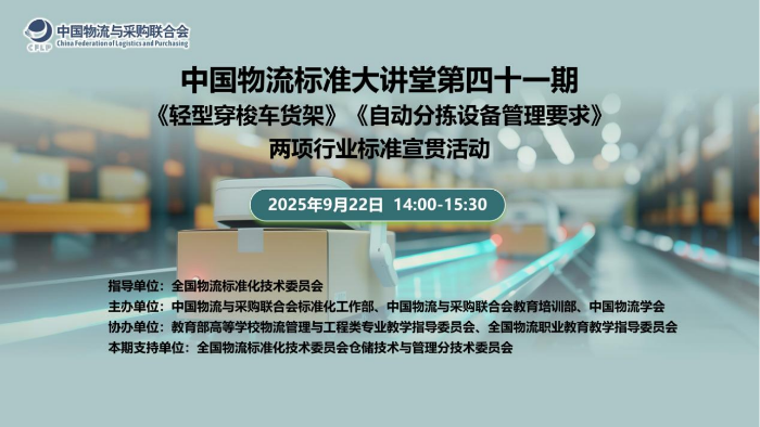 2025年9月22日,全国物流标准化技术委员会组织开展了“中国物流标准大讲堂”第41期活动,对物流行业标准《轻型穿梭式货架》(WB/T 1137-2023)、《自动分拣设备管理要求》(WB/T 1041-2024)进行宣贯,1600余人在线参加了活动。