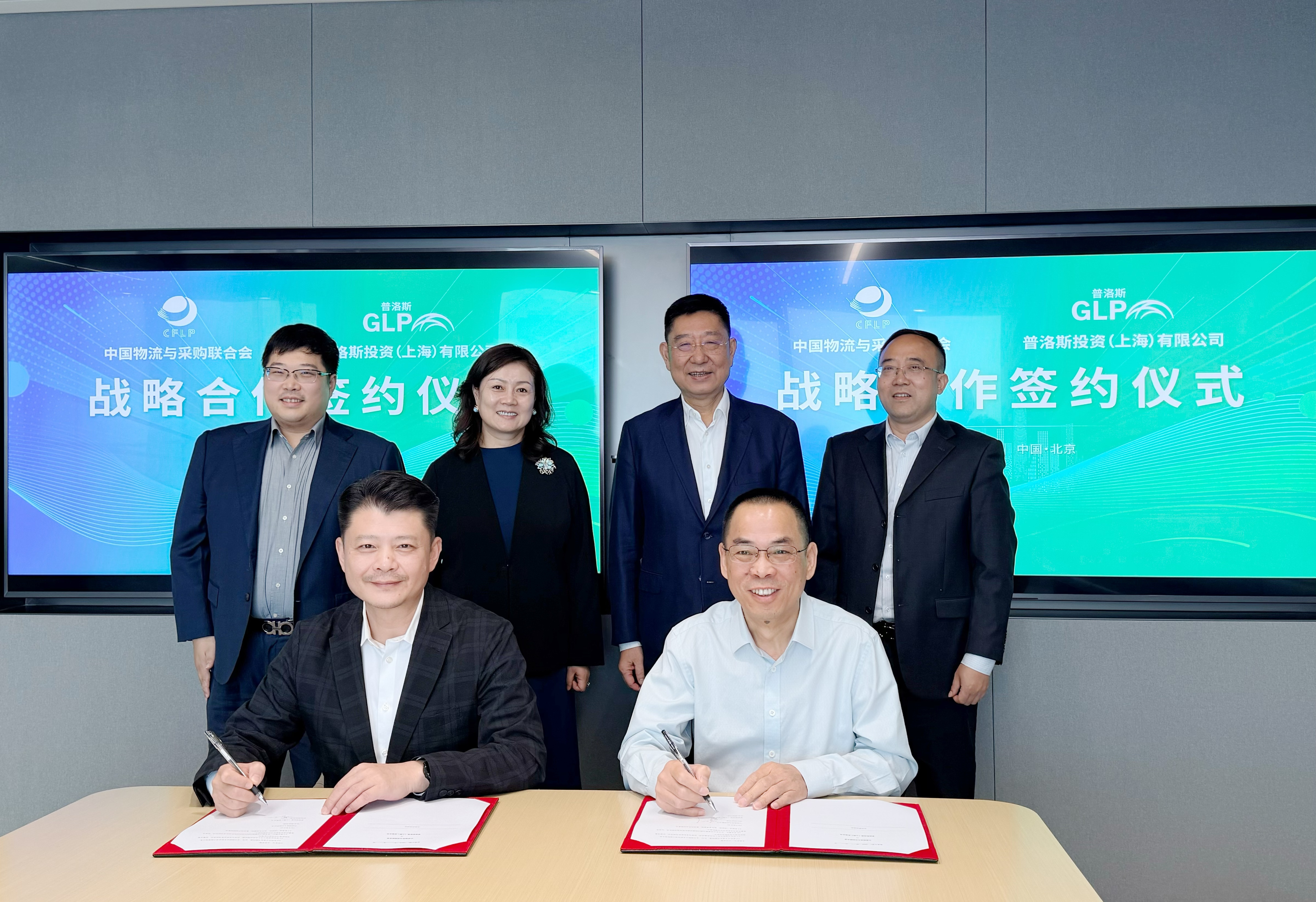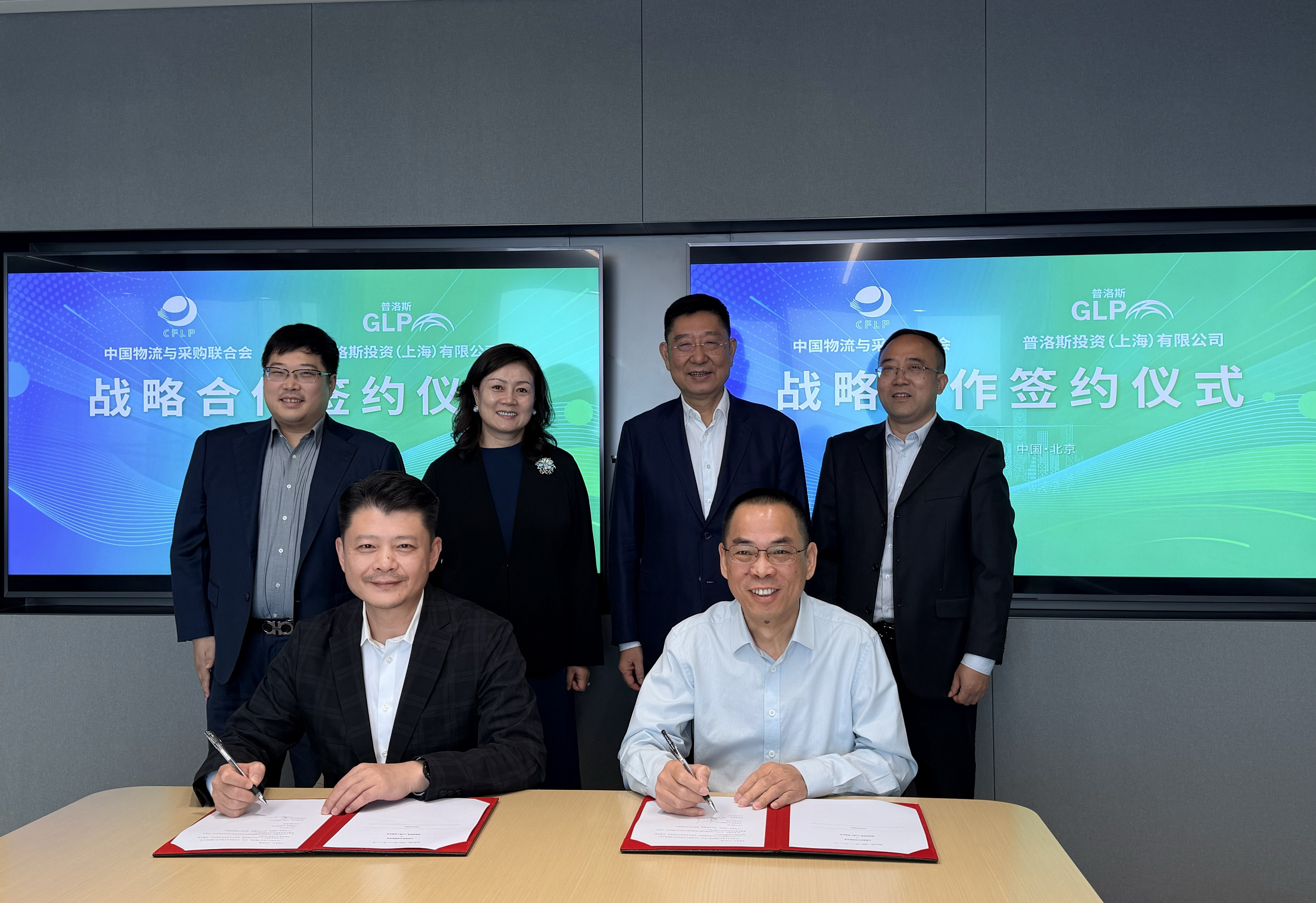 中国物流与采购联合会副会长胡大剑与普洛斯中国资产平台副首席运营官蔡晨代表双方签署协议。中国物流与采购联合会会长蔡进、普洛斯资产中国区总裁赵明琪、普洛斯中国资产平台战略营销副总裁熊忻恺出席仪式并见证签约。