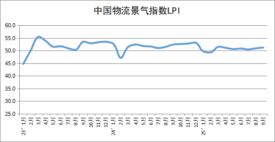 中国物流与采购联合会发布的2025年9月份中国物流业景气指数为51.2%,较上月回升0.3个百分点。