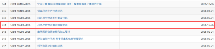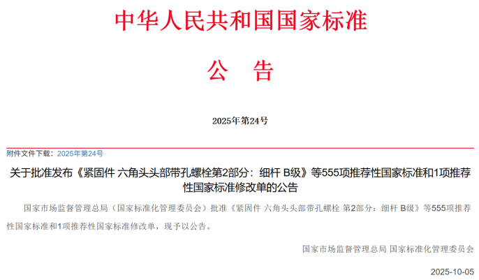 2025年10月5日,国家市场监督管理总局、国家标准化管理委员会发布2025年第24号《关于批准发布<紧固件 六角头头部带孔螺栓第2部分:细杆 B级>等555项推荐性国家标准和1项推荐性国家标准修改单的公告》,其中包括由全国物流标准化技术委员会提出并归口的《药品冷链物流追溯管理要求》(GB/T 46204-2025)国家标准。