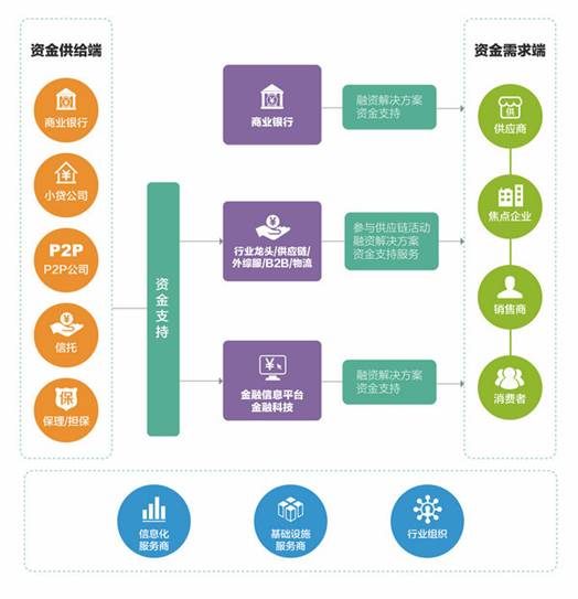 供应链金融生态包含四层架构:供应链金融源:供应链上的中小微企业;供应链金融实施主体;供应链金融资金提供方;供应链金融基础服务。