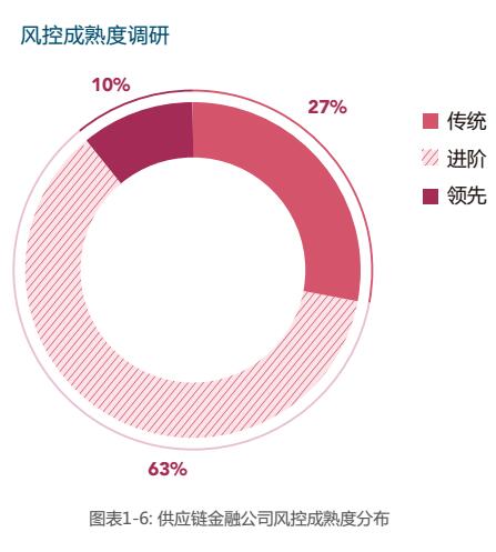 3、从风控成熟度角度,10%的企业已经建立了领先的风控系统和风险数据库,并以此为基础利用大数据分析技术构建了风险预测模型。63%的企业正在将数据分析、IT技术与传统风控流程进行融合进而提升风控能力。仍有27%的企业依赖传统的风控方法和工具。